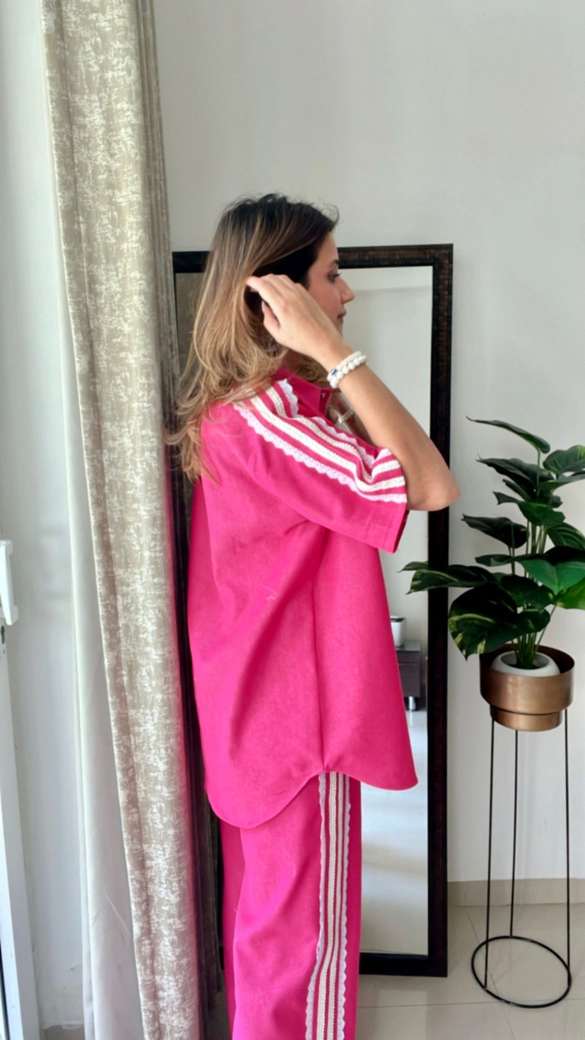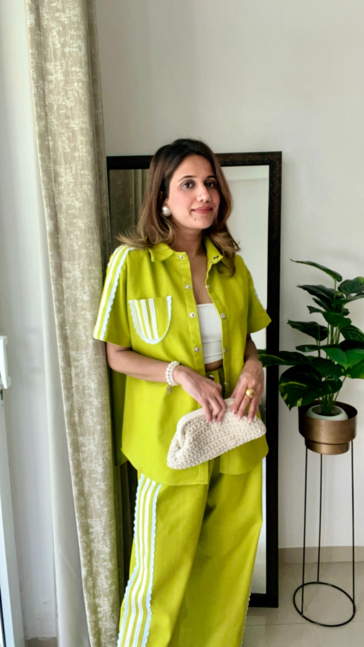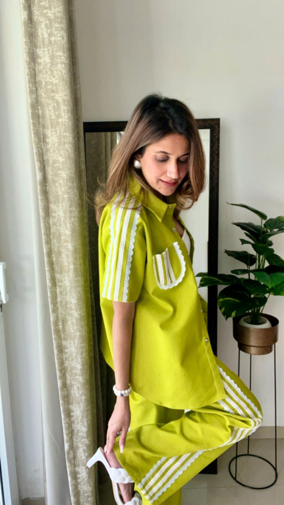 Light Denim Shirt set with oversized sleeves and tic tac buttons. High waist pants with same detailing on the sides .