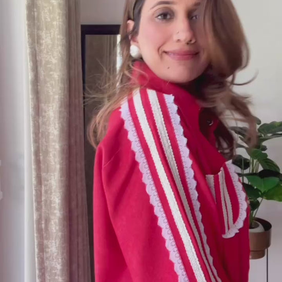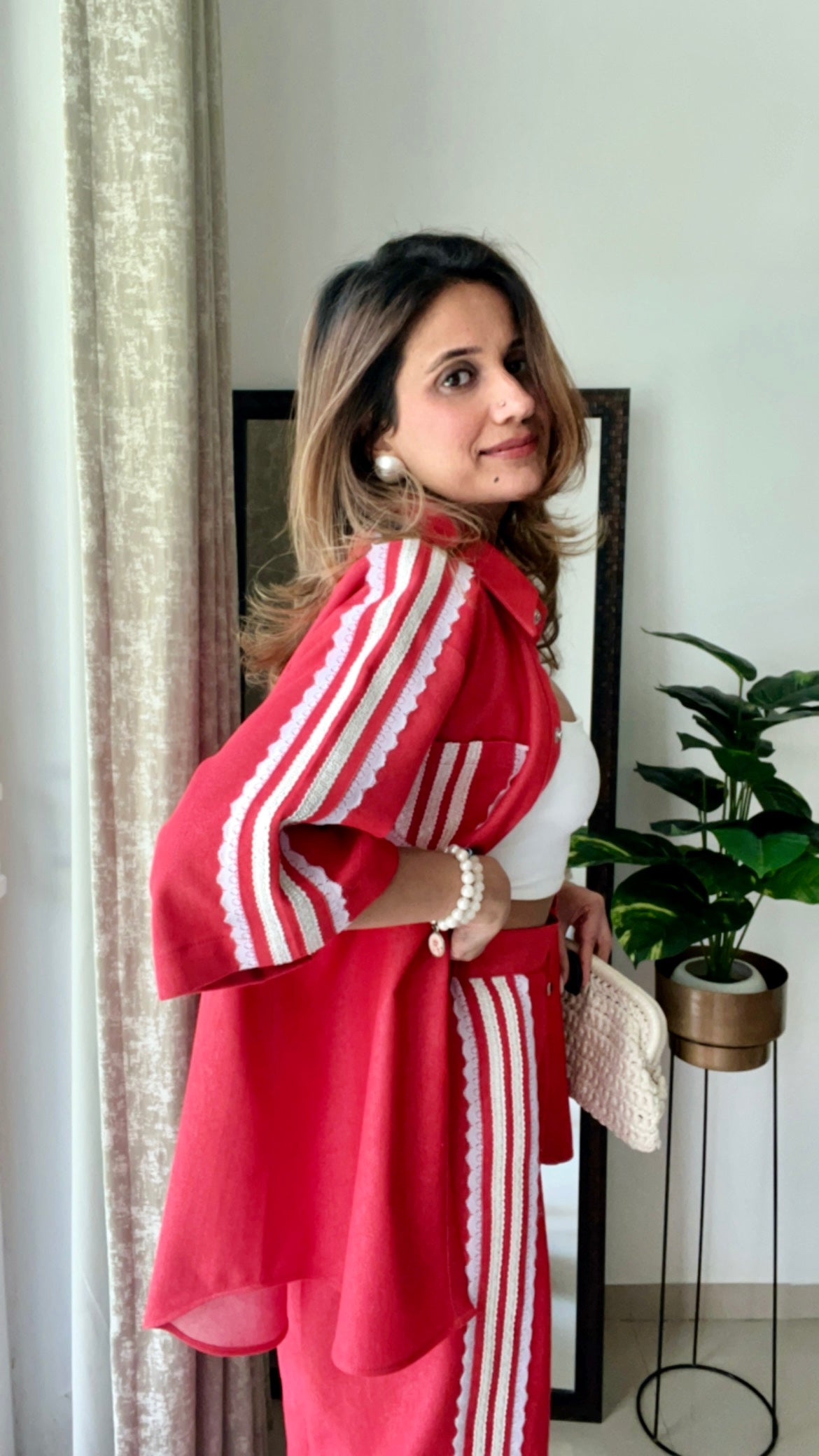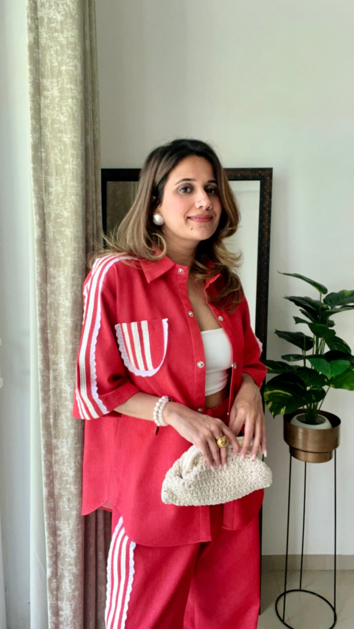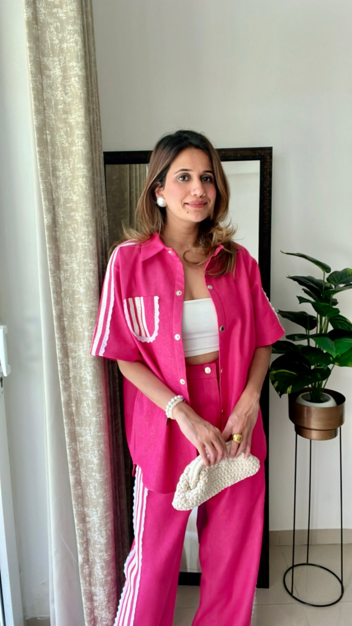 Light Denim Shirt set with oversized sleeves and tic tac buttons. High waist pants with same detailing on the sides .