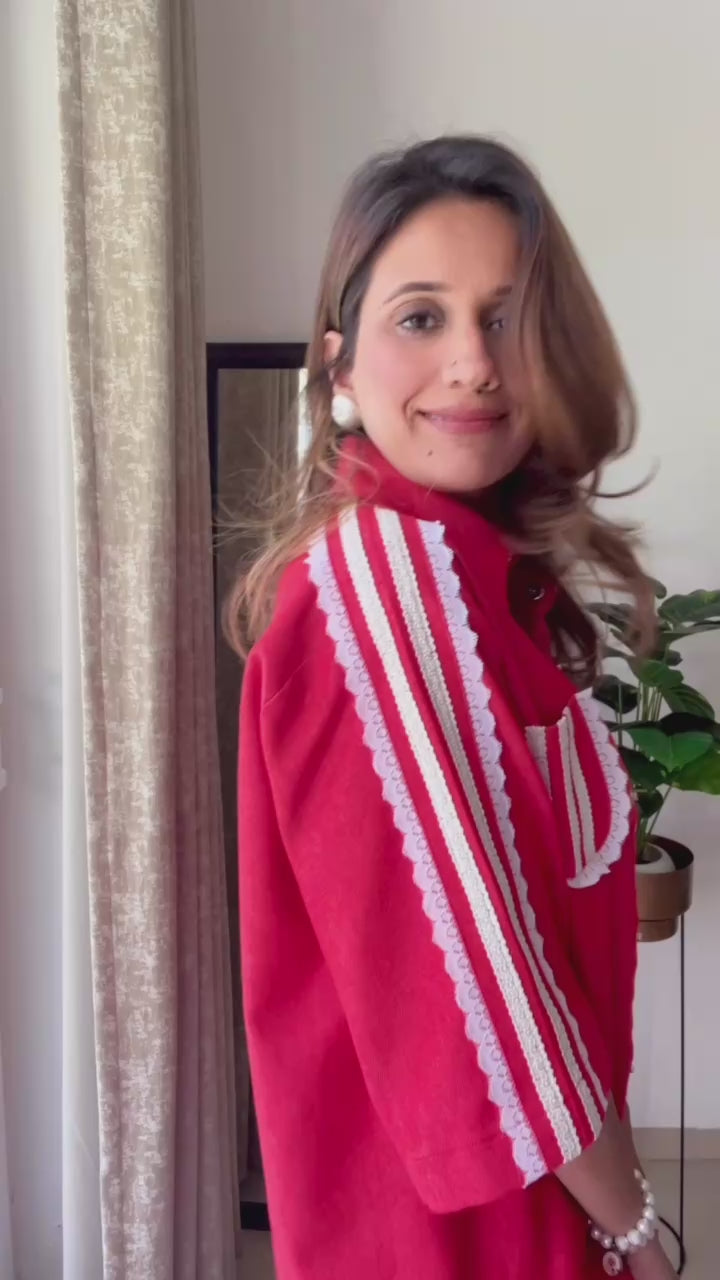Light Denim Shirt set with oversized sleeves and tic tac buttons. High waist pants with same detailing on the sides .