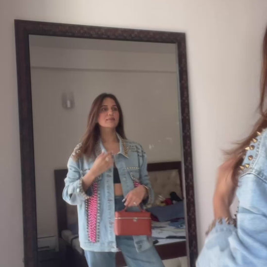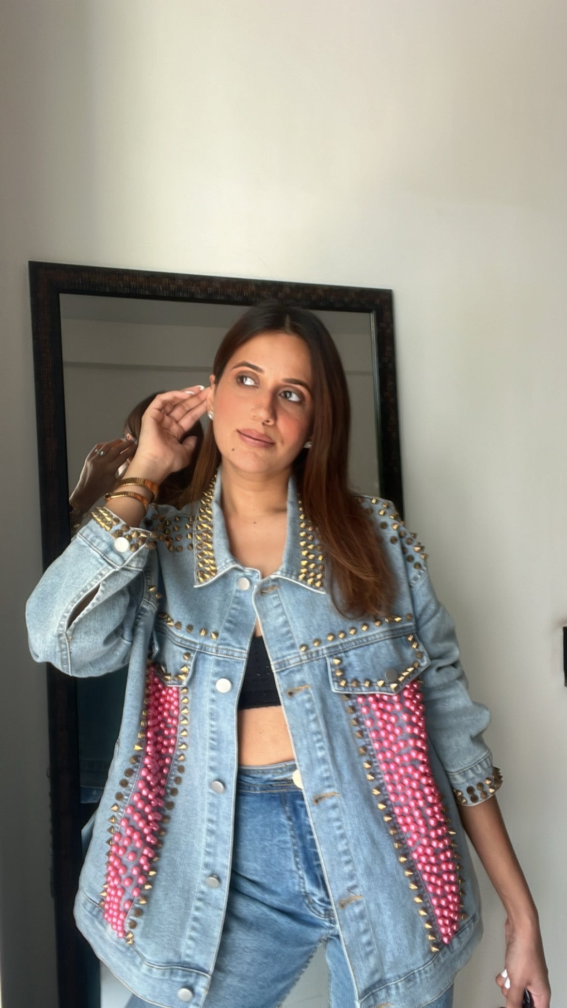 Splash of pearls and rivets, this oversized Denim Jacket is all you need to uplift your boring outfit and mood. It’s definitely a Keeper!