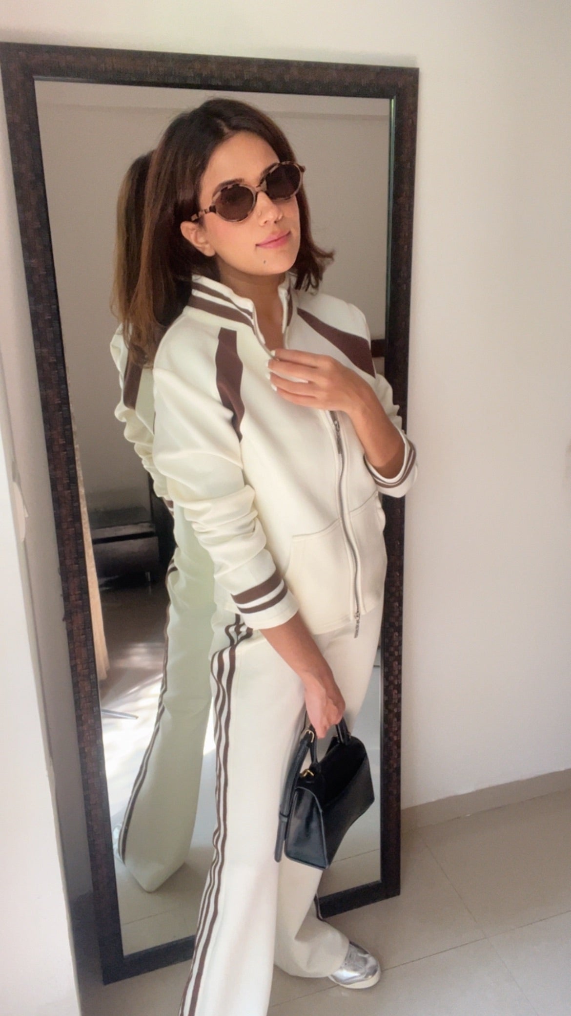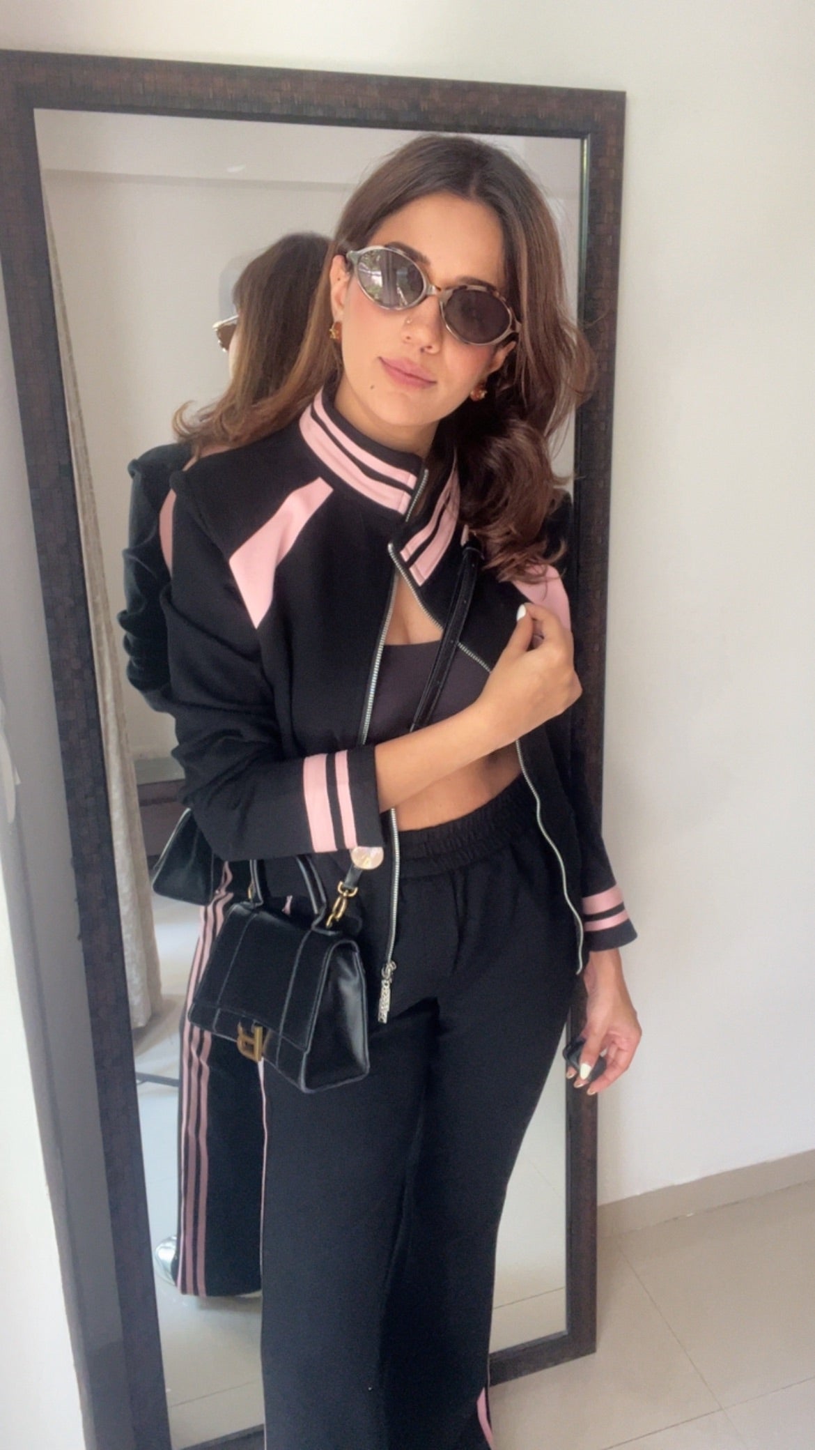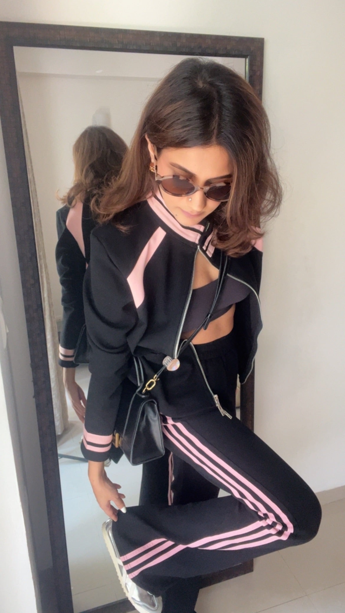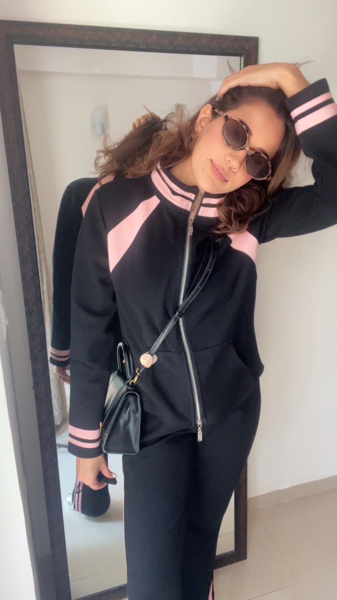 Step out in style with this chic black-and-blush athleisure co-ord. Designed for the modern woman on the move, it features sporty contrast panels, a sleek front-zip jacket, and relaxed-fit bottoms that deliver both comfort and confidence. Pair it with sneakers for a daytime look or dress it up with accessories for a street-style moment. Your perfect blend of ease and elegance.