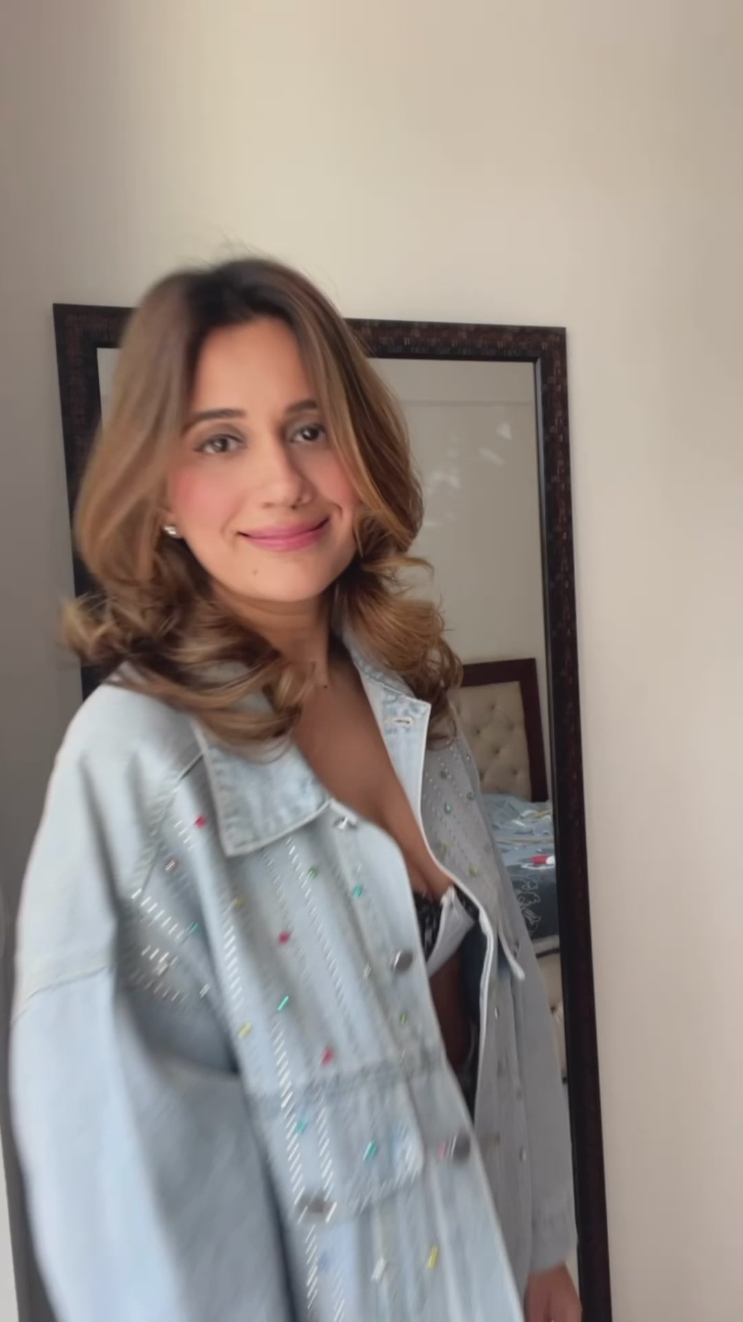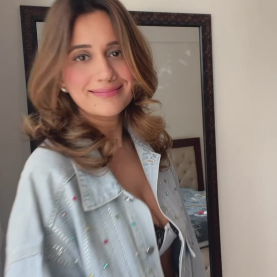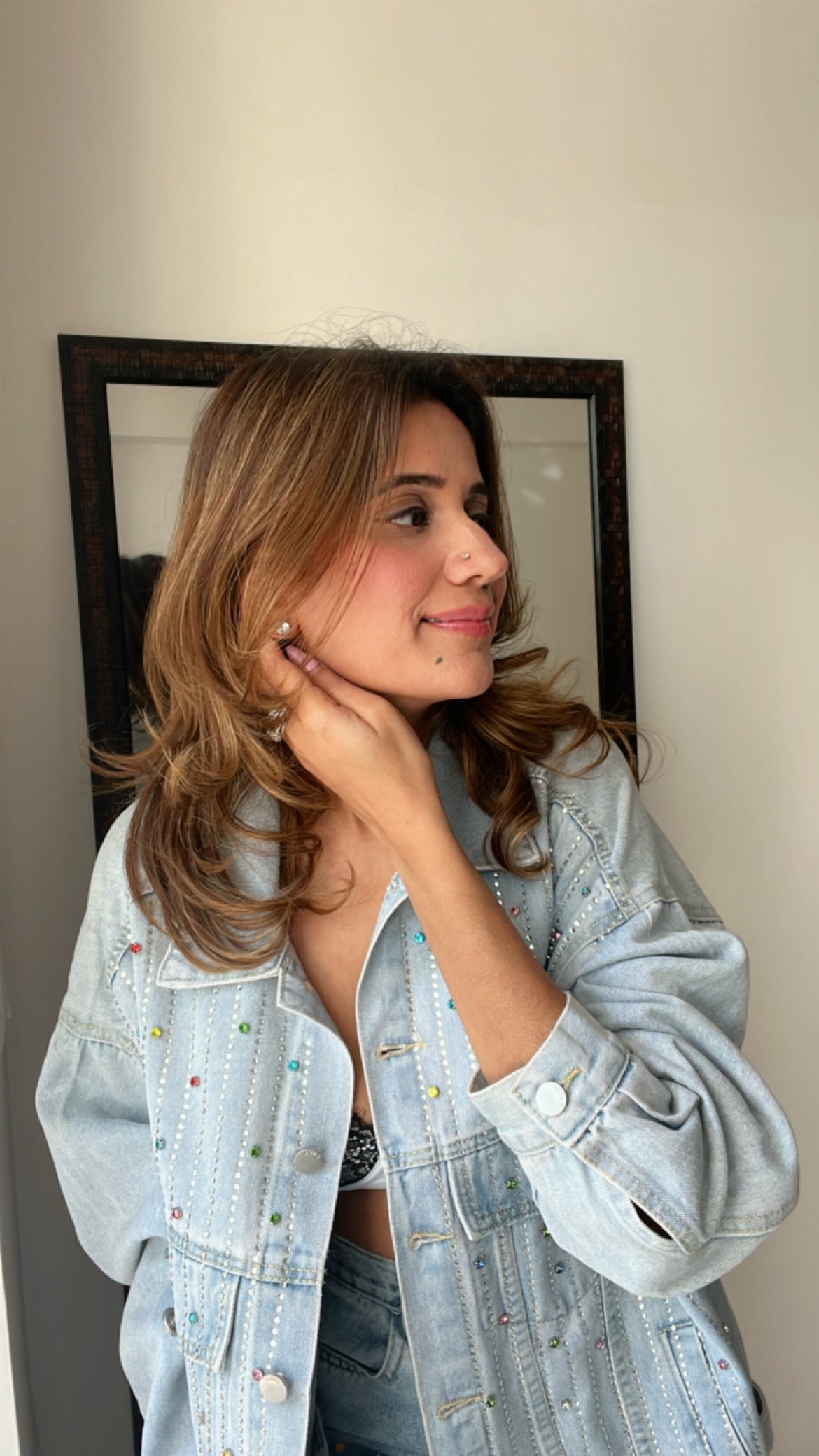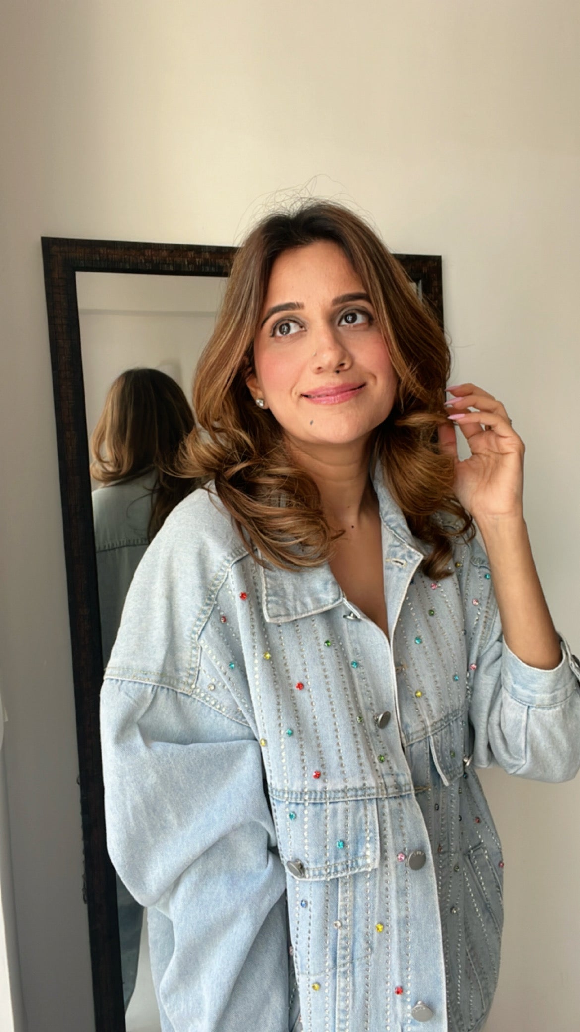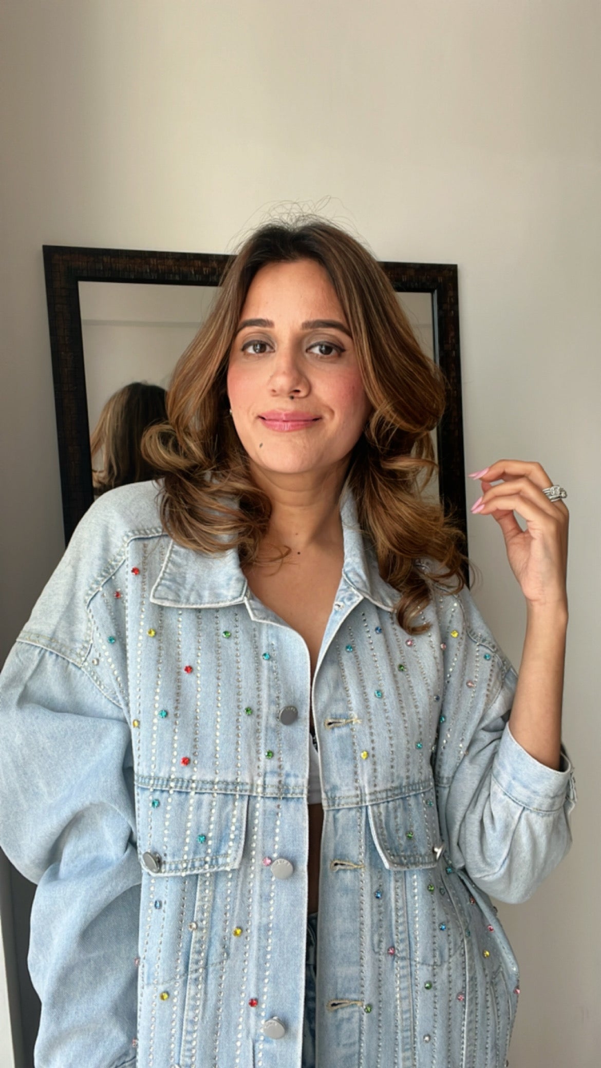 Soft Denim Jacket with multi color studs and embedded stones. Itโs definitely a classic piece with minimal color and bling!