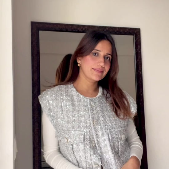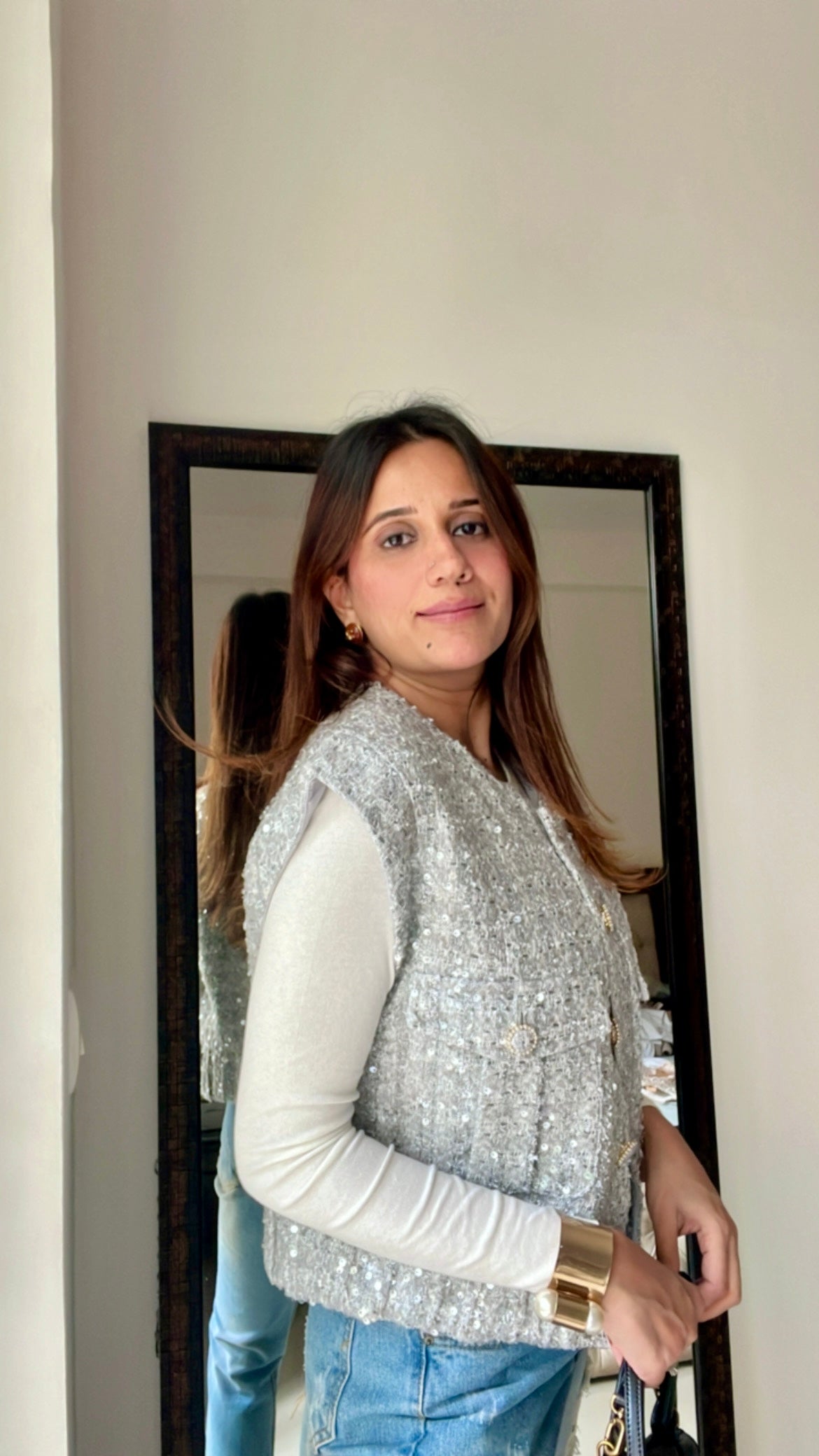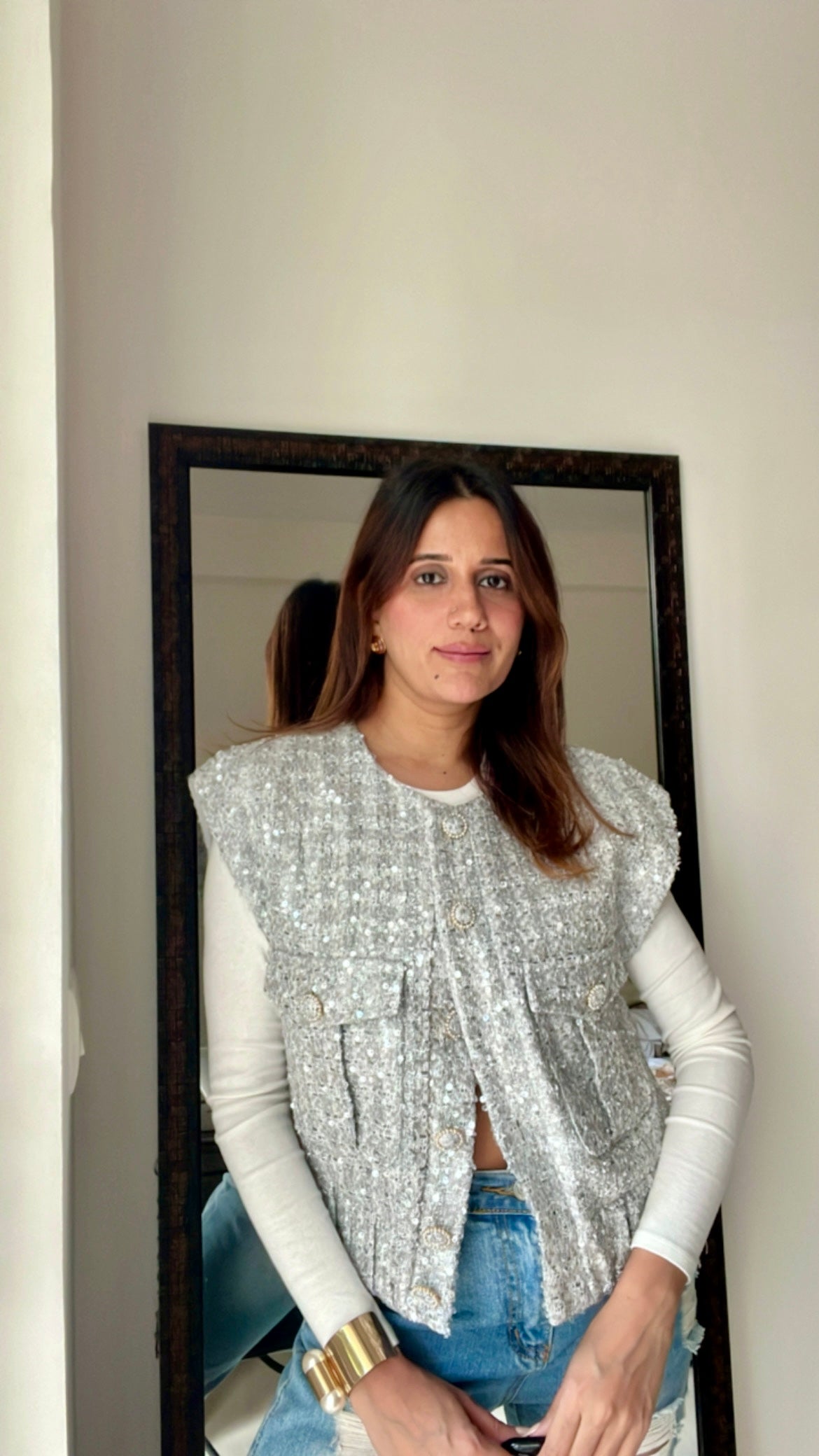 Sequin Embedded Cap sleeves Tweed Fall Vest