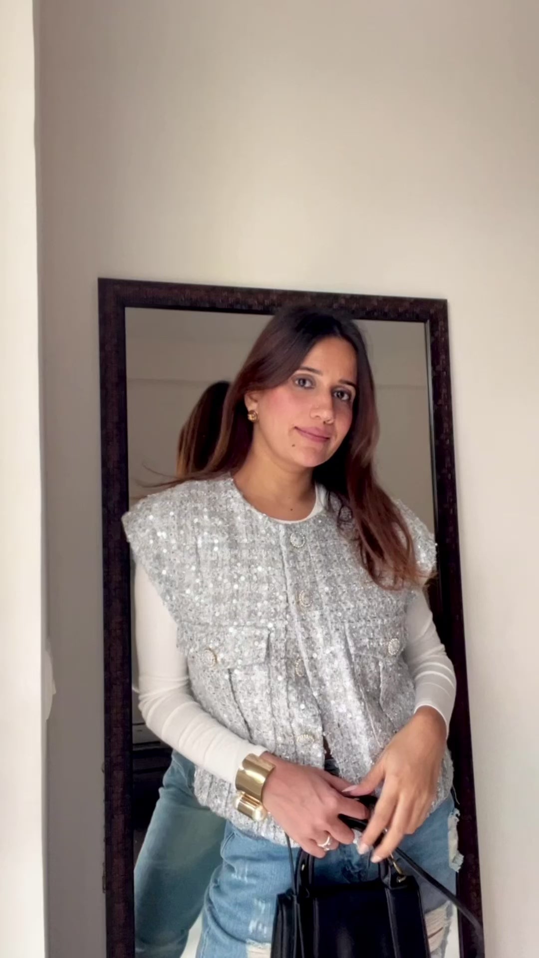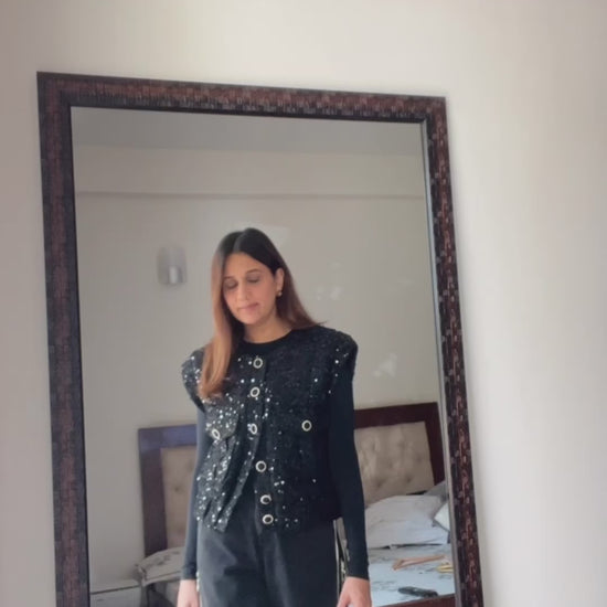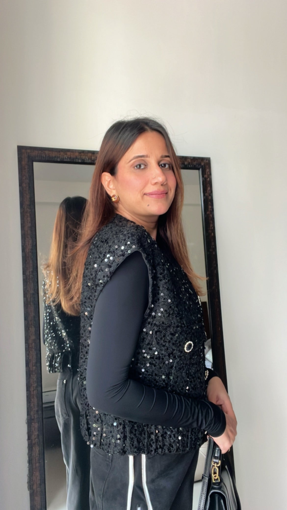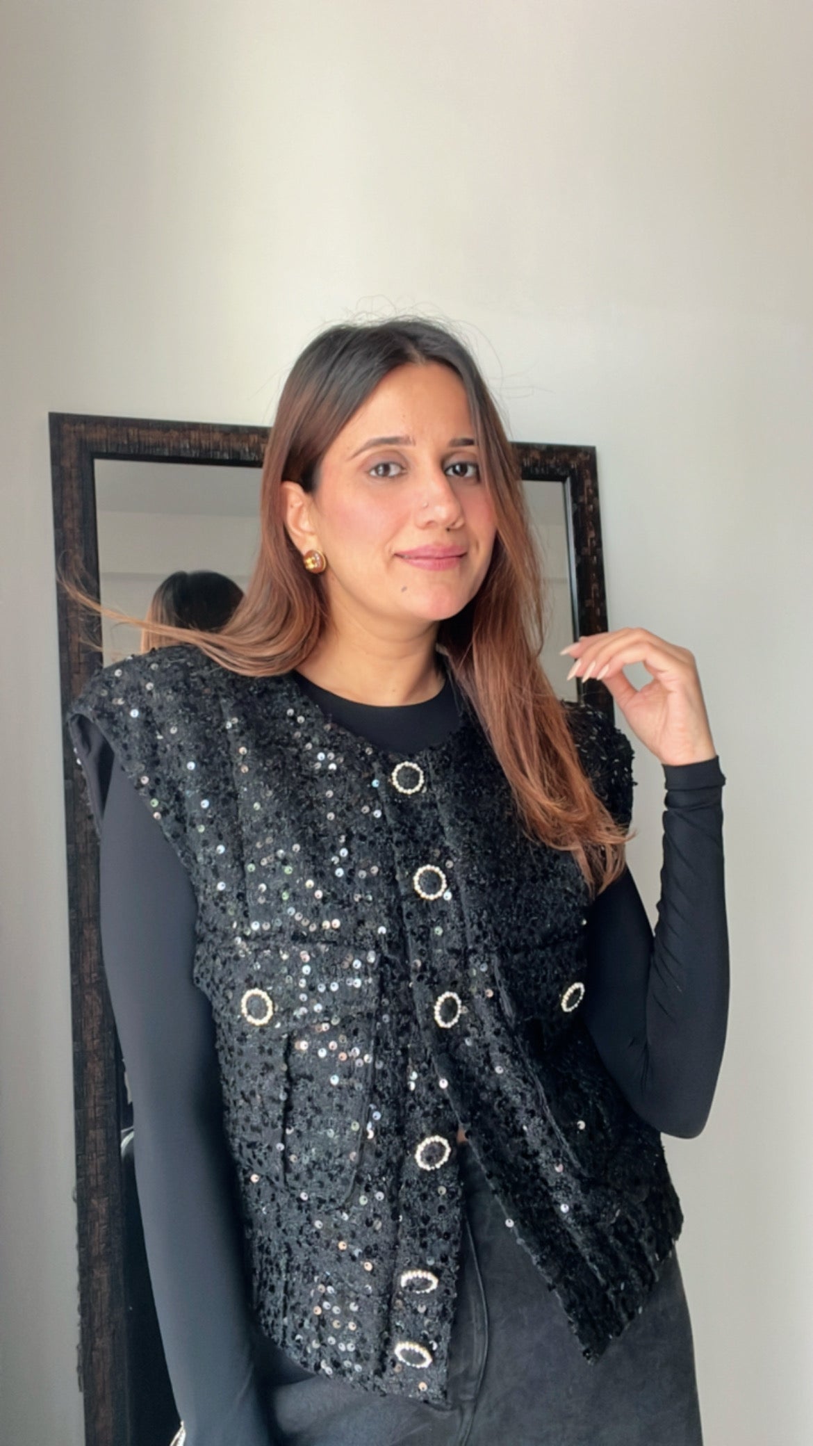 Sequin Embedded Cap sleeves Tweed Fall Vest