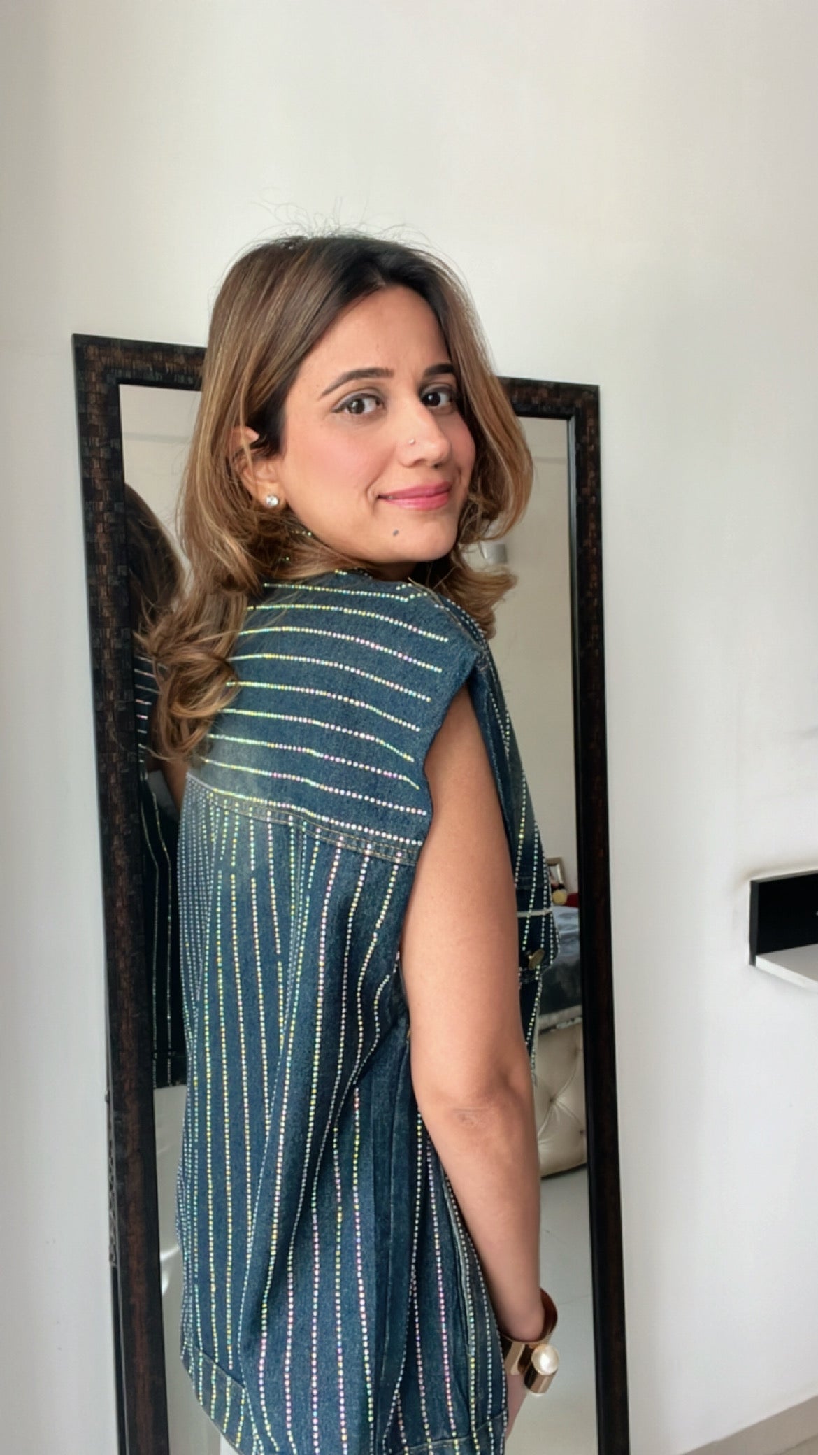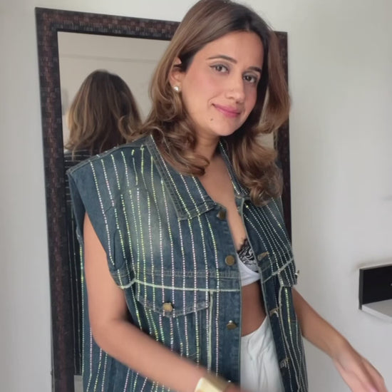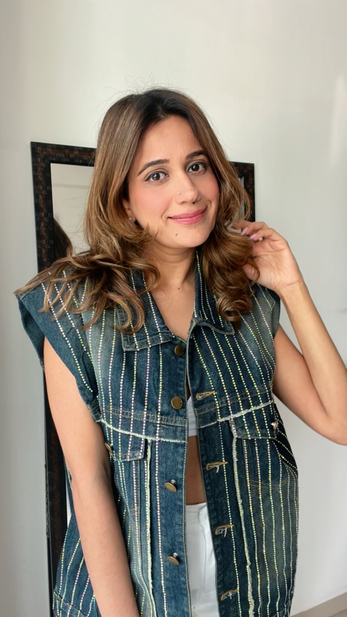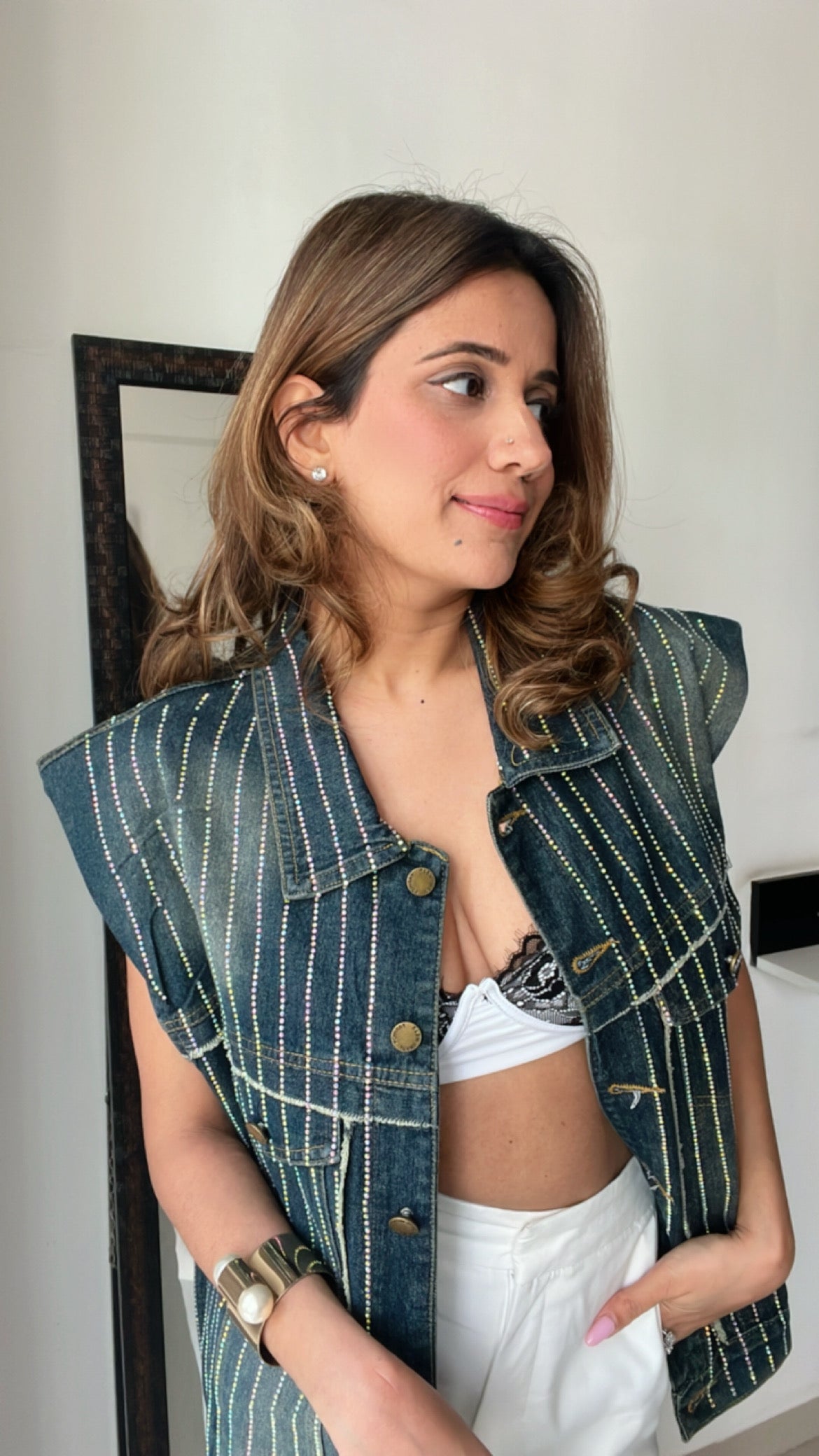 Cut Sleeves shoulder pad Denim Jacket with Swarovski embedded. Dress up or dress down with this one!