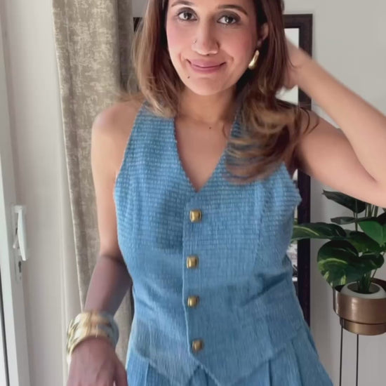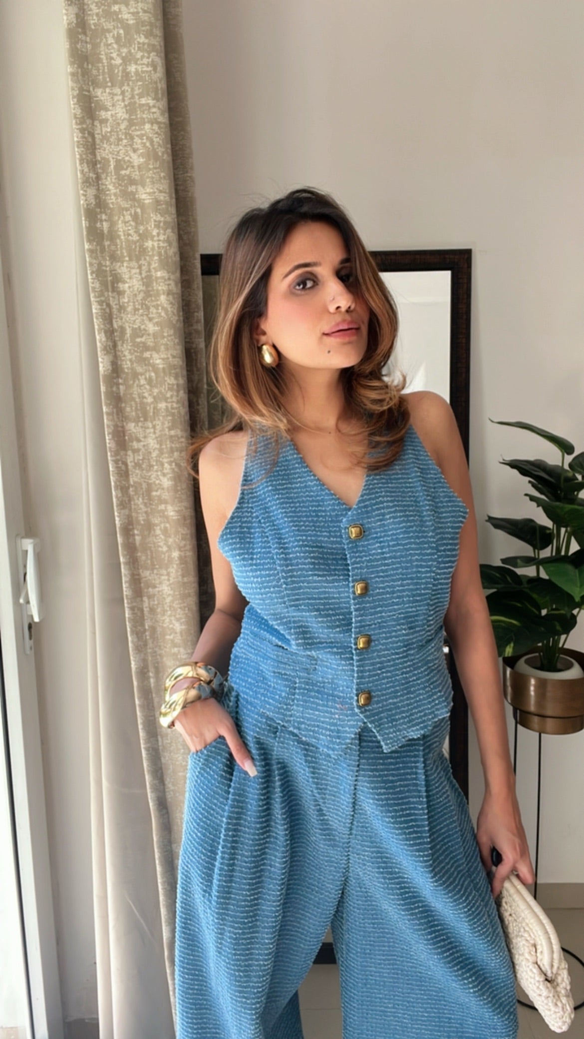 Ribbed Denim Waiscoat top with Flaired front pleated pants.